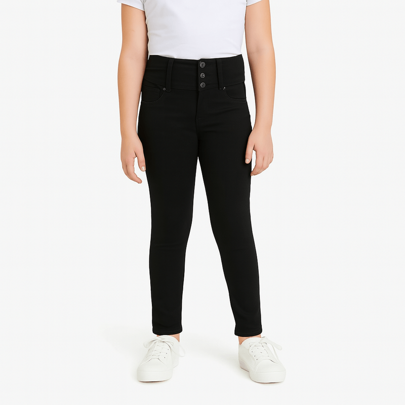 Skinny jeans para niña con estilo juvenil y diseño sólido en color negro, cuenta con ajuste de botón y cierre de zíper, trabillas que sujetan de manera adecuada el cinturón. Posee un tipo de corte ajustado ideal para combinar con blusas, camisetas y tus sneakers favoritos. *PRODUCTO SURTIDO SUJETO A DISPONIBILIDAD*